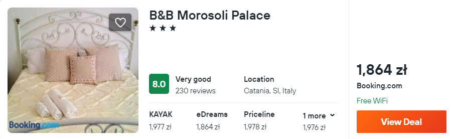 W Katanii polecam zakwaterowanie w pensjonacie B&B Morosoli Palace. Do miejsca noclegowego dostaniesz się komunikacją publiczną lub wynajętym samochodem.