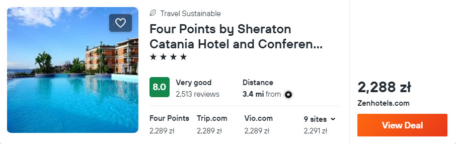 Na włoskiej wyspie zatrzymasz się w bardzo dobrym 4* hotelu Four Points by Sheraton, który znajduje się w spokojnej części Katanii. Z lotniska w okolice miejsca noclegowego dojedziesz komunikacją publiczną (autobus + pociąg) lub wypożyczonym samochodem – szczegóły poniżej.