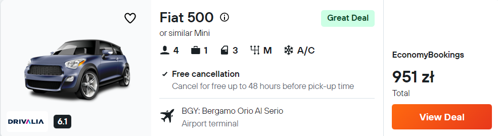 Wypożycz auto już na lotnisku w Bergamo. Samochód pozwoli ci wygodnie dojechać do hotelu i zwiedzić okolicę.