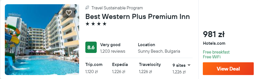 W Słonecznym Brzegu polecam ci noclegi z codziennymi śniadaniami w 4* hotelu Best Western PLUS Premium Inn. Każdy pokój wyposażony został w klimatyzację, lodówkę, czajnik elektryczny oraz telewizor LCD. W łazience jest prysznic, suszarka do włosów oraz podstawowe przybory toaletowe. We wszystkich pomieszczeniach będziesz mieć zapewniony dostęp do sieci WiFi.