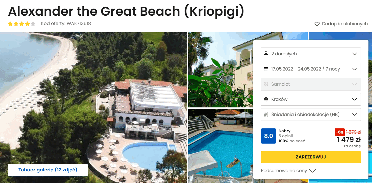 W Grecji zakwaterowani będziecie w 4* hotelu Alexander the Great Beach, który znajduje się tuż przy plaży w miejscowości Kryopigi. Na terenie obiektu mieści się odkryty basen oraz leżaki i parasole przeciwsłoneczne. Wszystkie pokoje są klimatyzowane – w każdym jest łazienka z prysznicem i suszarką do włosów. W cenie pobyt zapewnione będziecie mieli dwa posiłki dziennie (śniadania i obiadokolację) opiekę rezydenta oraz transfer: lotnisko-hotel-lotnisko.