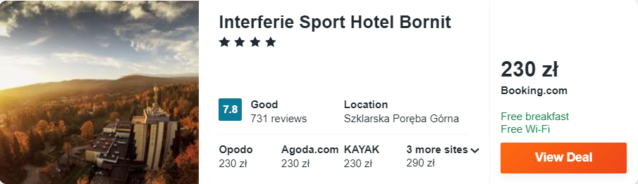 Dowiedzcie się więcej o tym hoteluW Szklarskiej Poręby, gdzie mieści się dobry 4* hotel Interferie Sport Bornit. Zatrzymujący się w nim goście, w cenie zakwaterowania mogą liczyć na codzienne śniadania, dostęp do strefy fitness oraz wellness (kryty basen, sauna, wanna z hydromasażem).