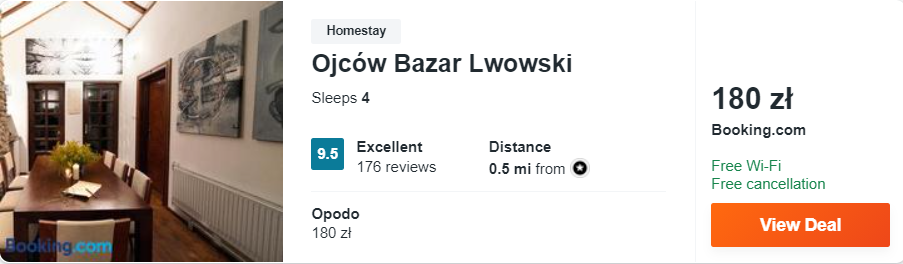 Dowiedzcie się więcej o tym hoteluSzybko przenosimy się z północy na południe. W województwie małopolskim mam dla was ofertę pobytu w Ojców Bazar Lwowski. Obiekt od bram Ojcowskiego Parku Narodowego oddalony jest o nieco ponad 11 km. Na miejscu dla gości przygotowano bezpłatny parking.
