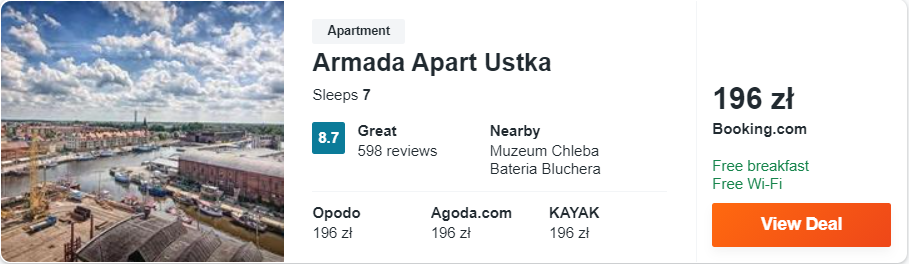Dowiedzcie się więcej o tym hoteluWracamy nad Bałtyk, ale tym razem proponuję wam zakwaterowanie w Armada Apart Ustka. Obiekt mieści w centralnej części portu, nieopodal centrum Ustki, w odległości 500 metrów od latarni morskiej i plaży miejskiej.