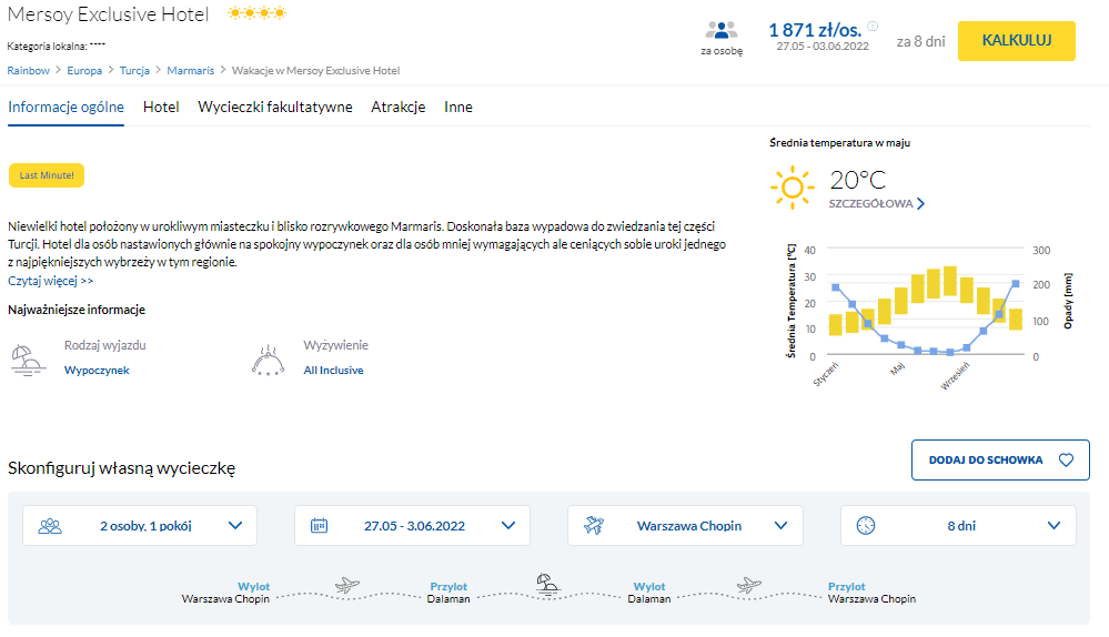 W podróż do Turcji udacie się w wiosennym terminie 27 maja – 3 czerwca. Czeka was lot z Warszawy do Dalaman, realizowany na pokładzie samolotu linii lotniczej Smartwings. W cenę pakietu wliczono również bagaż rejestrowany.