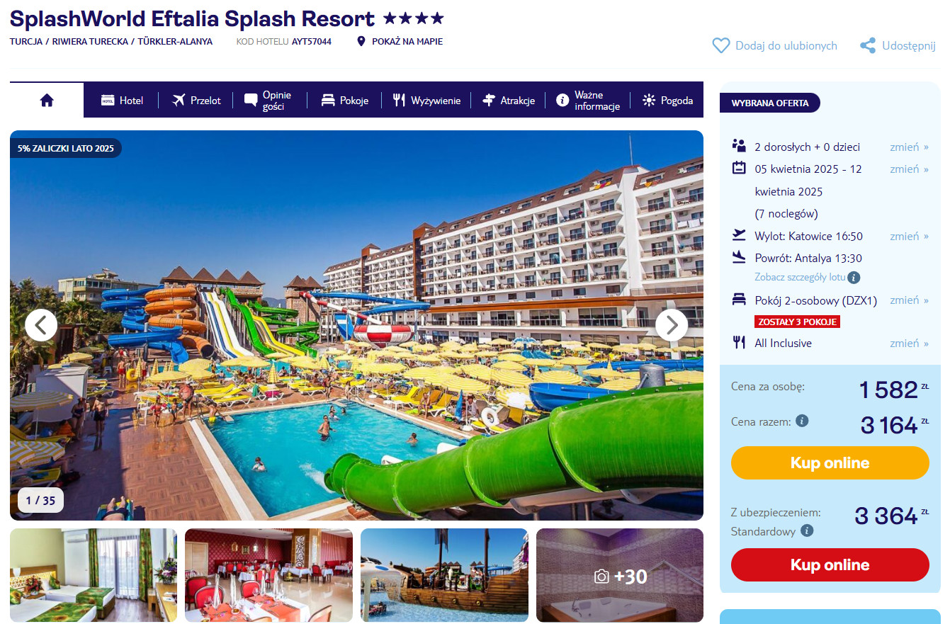 Na miejscu zatrzymasz się w bardzo dobrym 4* hotelu SplashWorld Eftalia Splash Resort, który znajduje się nieopodal plaży (leżaki w cenie). Na terenie obiektu mieszczą się 3 baseny, 8 zjeżdżalni dla dorosłych, 3 zjeżdżalnie dla dzieci, wodny plac zabaw, sauna sucha, łaźnia parowa. Każdy pokój wyposażony jest w klimatyzację, telewizor LCD oraz lodówkę. W łazience jest prysznic.