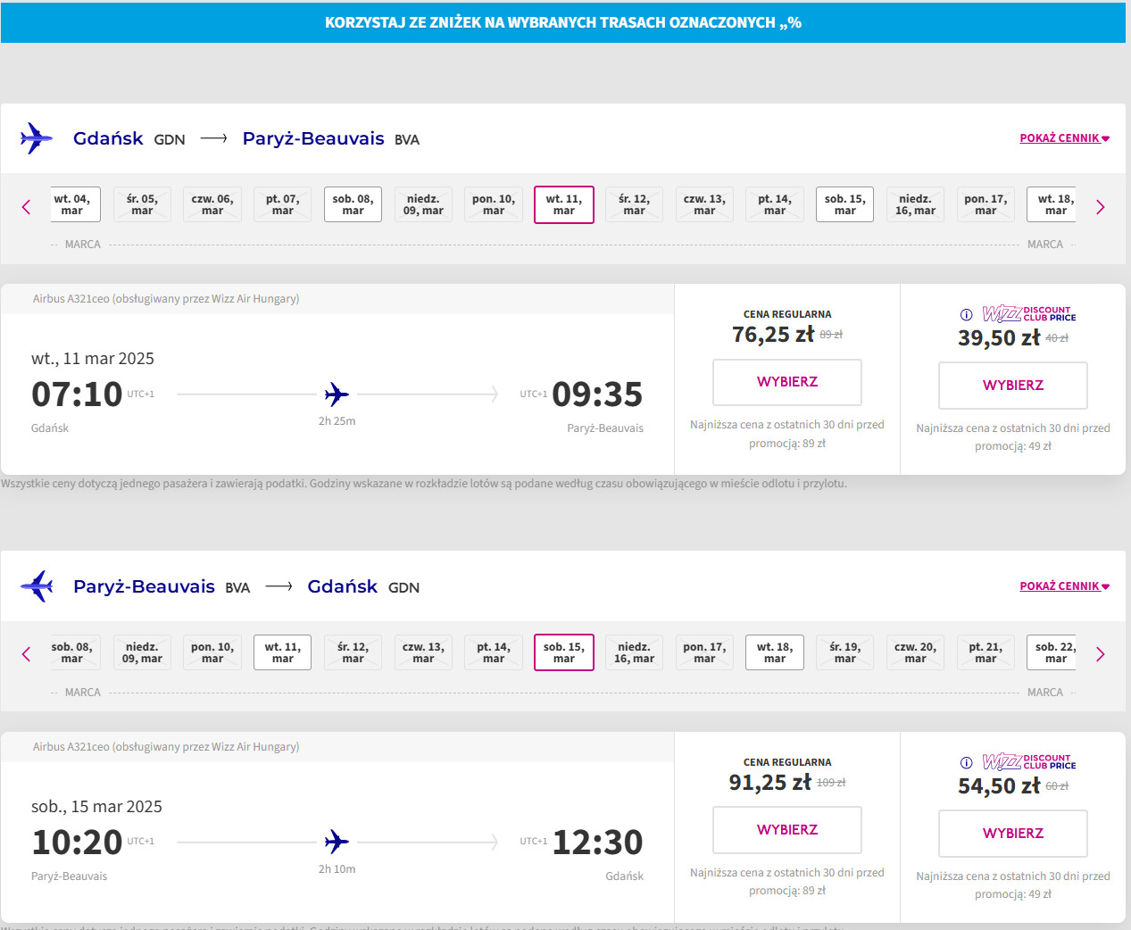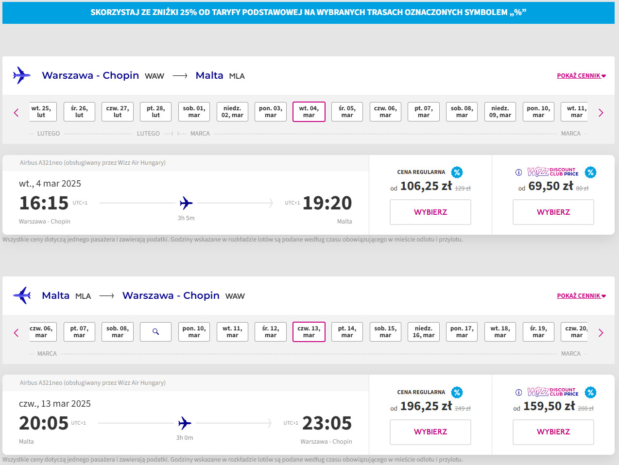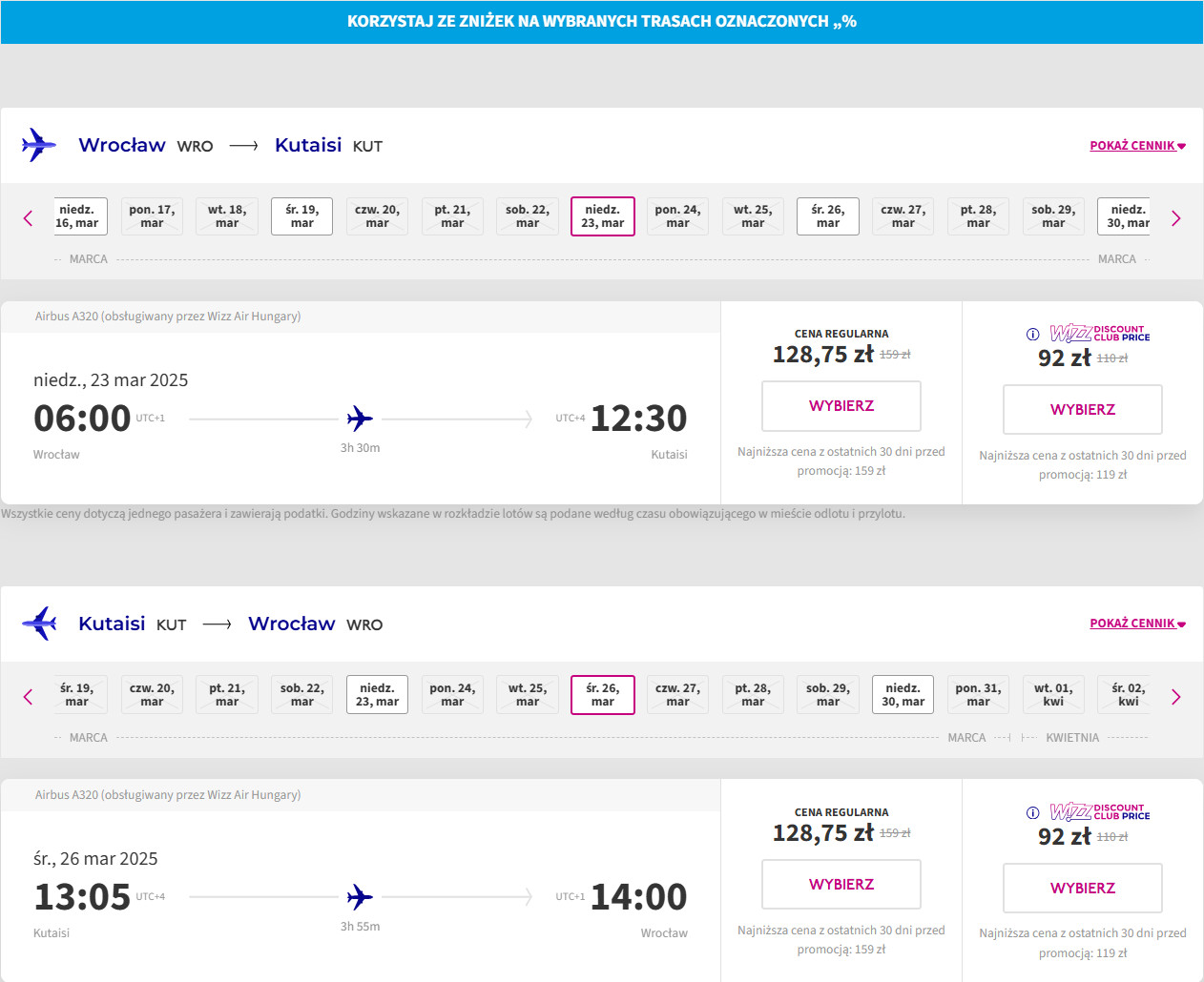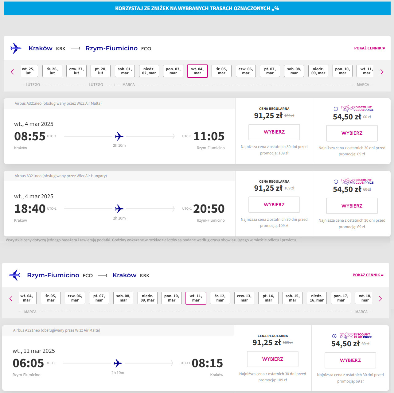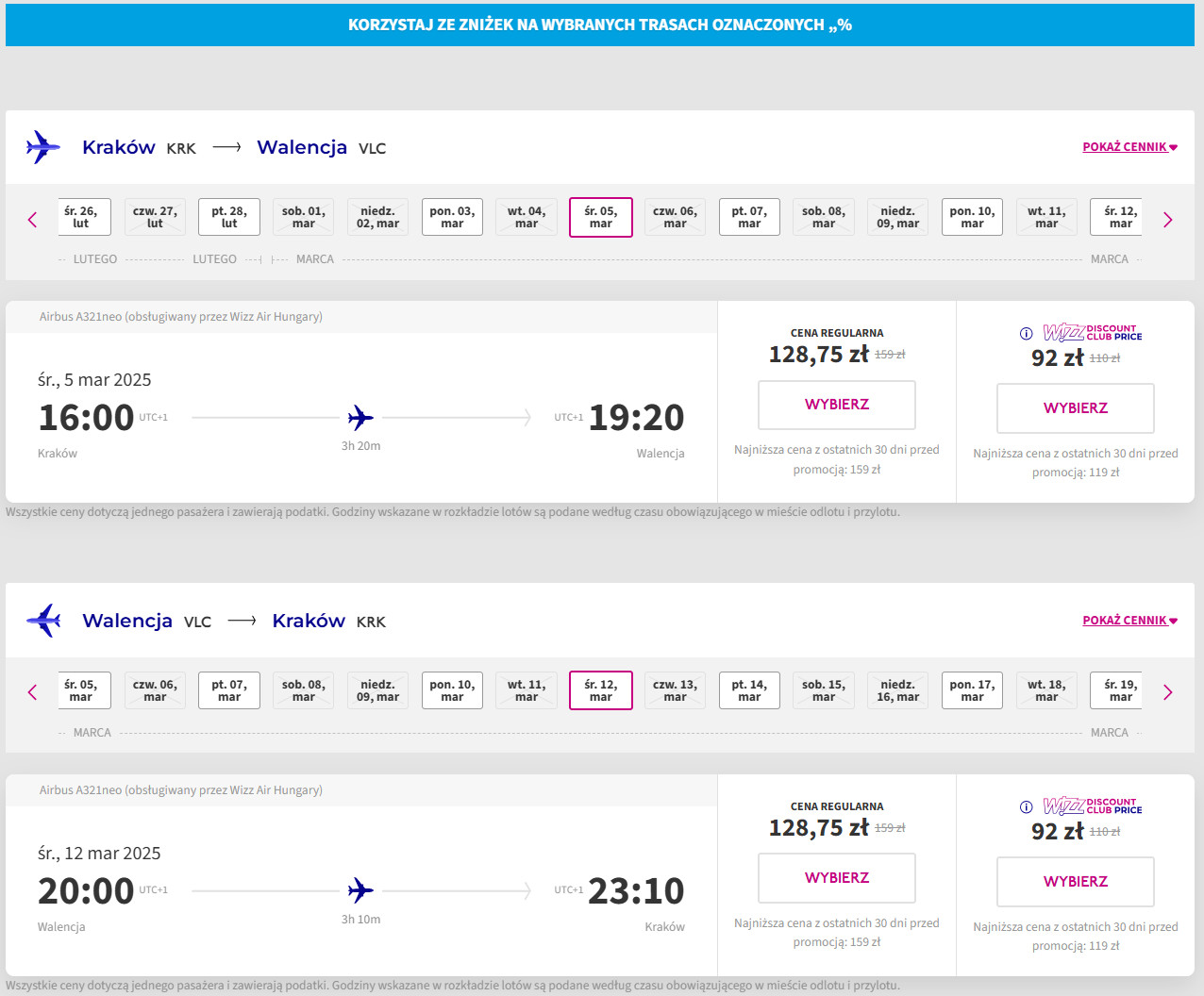 Nie posiadasz konta Wizz Discount Club? W takim razie za bilety zapłacisz 138 PLN/osoba (lot w dwie strony).
