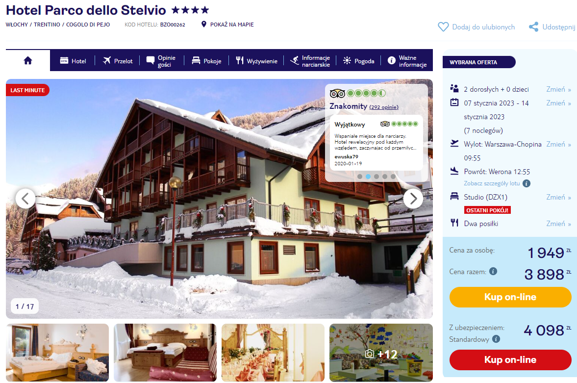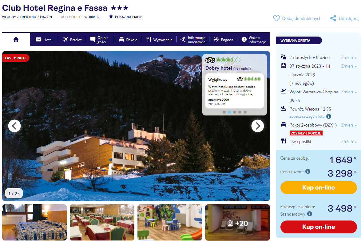Tym razem do wyboru masz dwie opcje: pobyt w 3* Club Hotel Regina e Fassa oraz w 4* hotelu Parco dello Stelvio. Oba obiekty oferują dogodną lokalizację niedaleko stoków narciarskich w Trydencie (na przykład Pozza di Fassa i Campitello). W cenę pakietów wliczono wyżywienie w postaci śniadań i obiadokolacji.