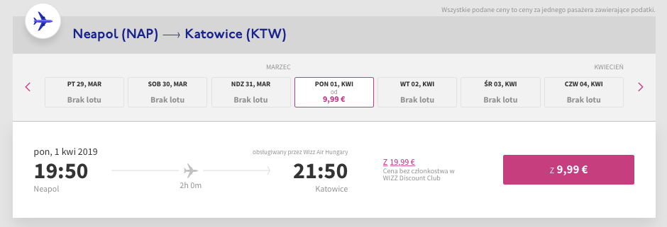 Wizz Air | Neapol – Katowice | 9,99 EUR ok. 43 PLN | 1 kwietnia