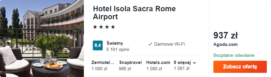 W pierwszym etapie swoich włoskich wakacji zatrzymacie się w bardzo dobrze ocenianym 4* hotelu Isola Sacra Rome. Co wyróżnia ten obiekt? Przepiękny ogród z basenem na świeżym powietrzu. Stosunek ceny do jakości? Wyborny! Martwicie się odległością od plaży? To tylko 20 minut drogi autobusem nr 2, a zyskujecie lepszy komfort pobytu.