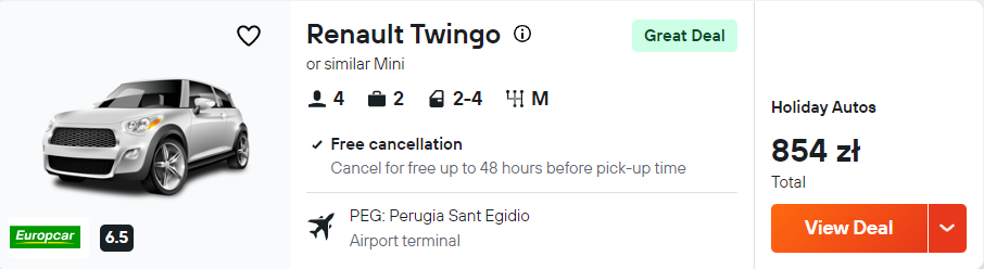 Zachęcam cię do wypożyczenia samochodu po przylocie do Włoch. Mają do swojej dyspozycji auto, łatwo i wygodnie dojedziesz do Asyżu oraz nad włoskie wybrzeże Morza Adriatyckiego.