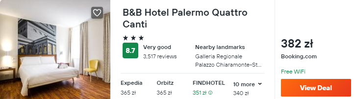 W Palermo wybrałem dla was noclegi w 3* hotelu B&B Hotel Quattro Canti. Obiekt usytuowany jest w samym centrum miasta. Od większości atrakcji dzielić was będzie kilka minut spaceru.