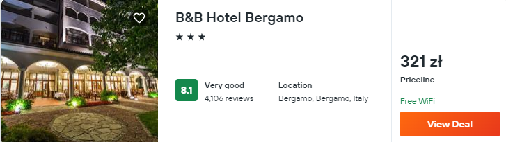 Natomiast w Bergamo proponuję wam zakwaterowanie w B&B Hotel Bergamo, który jest świetnie ocenianym obiektem zlokalizowanym w centrum miasteczka.