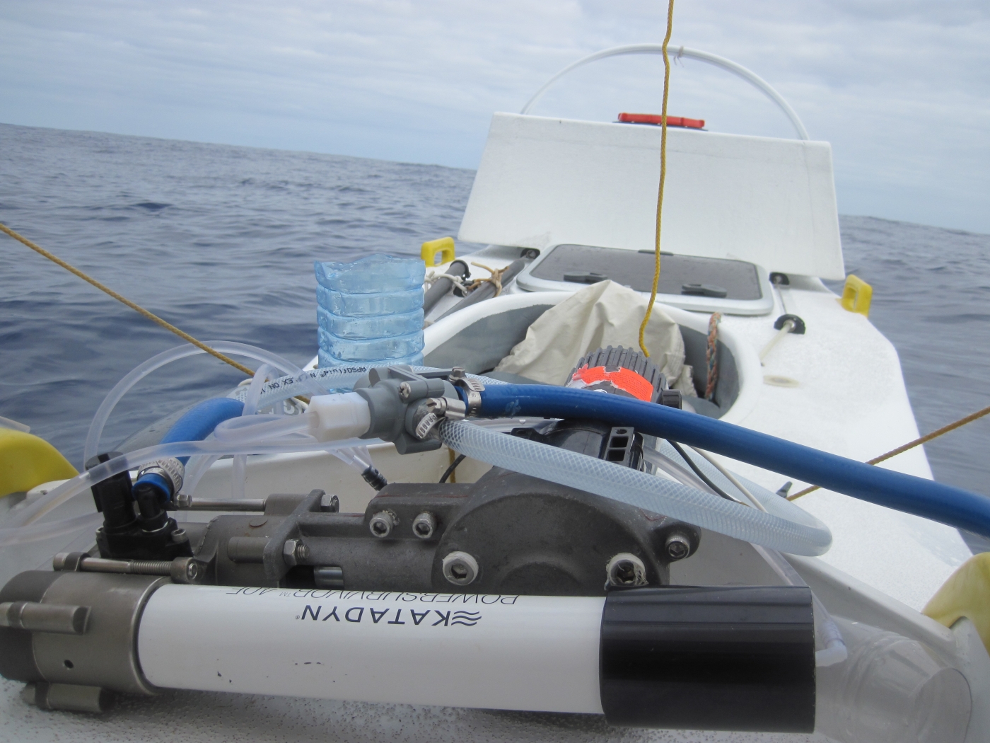 Mam trzy odsalarki: elektryczną i dwie zapasowe, ręczne. I tak się składa, że zawsze coś się z tą elektryczną działo… i musiałem używać ręcznej. Rytm dobowy wtedy dzielił się na 8-12 godzin wiosłowania, oraz 3 godziny pracy przy pompowaniu, aby mieć co pić. Miałem także żelazny zapas, w postaci kilkunastu plastikowych butelek z wodą, kupionych w sklepie.