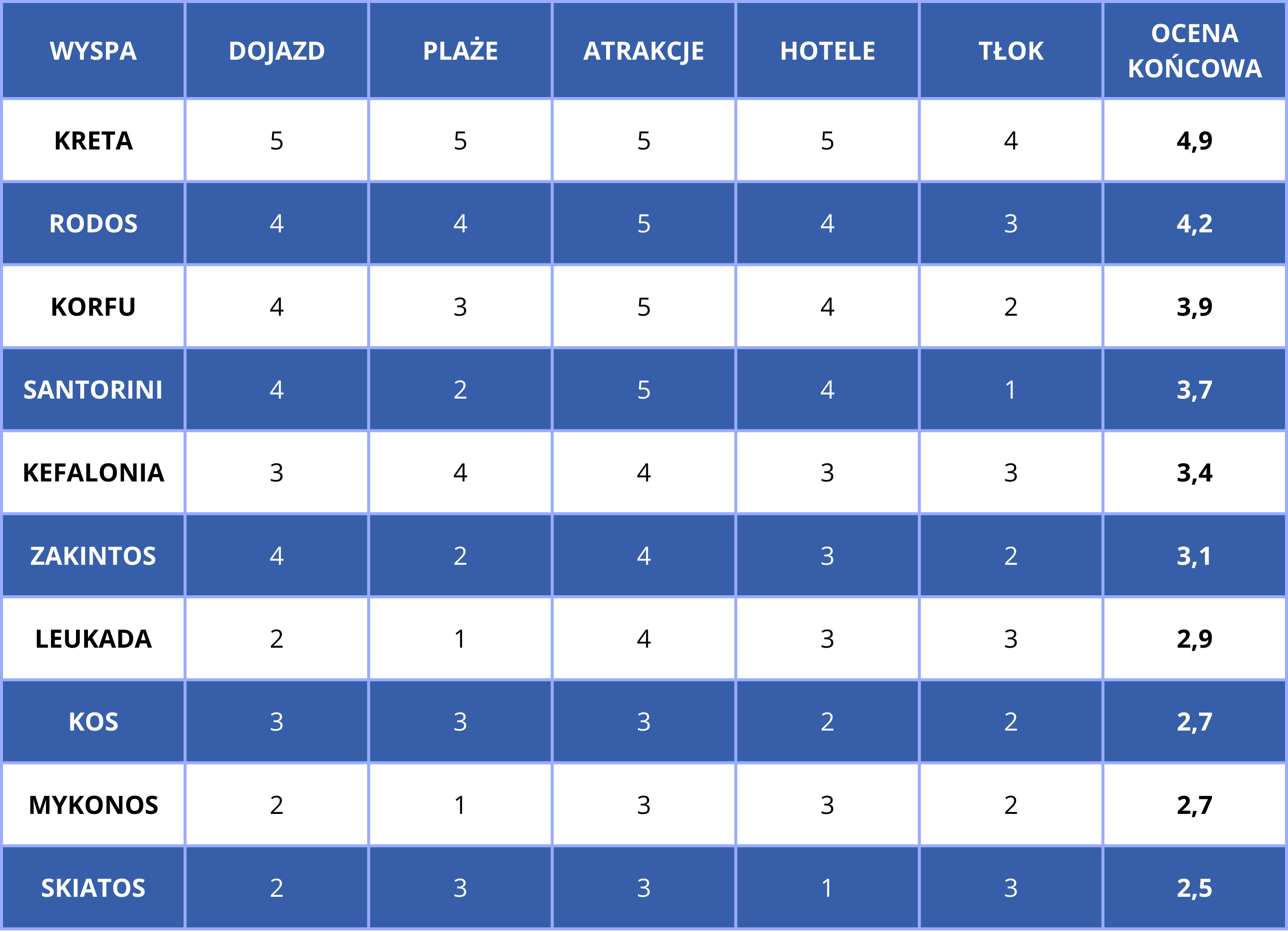 Każdą wyspę oceniliśmy w pięciu kluczowych kategoriach, które w największym stopniu wpływają na decyzje urlopowe Polaków. Każde kryterium ocenialiśmy w skali 1–5, gdzie 1 oznacza niski komfort lub ograniczoną atrakcyjność, a 5 najwyższą jakość i wygodę. Wyjątkiem jest kryterium zatłoczenia – im mniejszy tłok turystyczny, tym wyższa ocena.