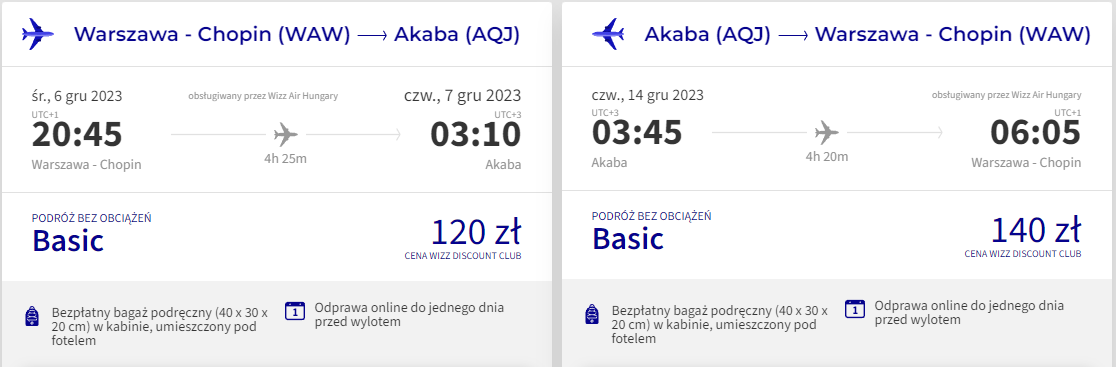 Do Akaby polecisz z warszawskiego lotniska im. Fryderyka Chopina w terminie 6(7)-14 grudnia, na pokładzie samolotów linii lotniczej Wizz Air. Pamiętaj, że bilety w najniższej cenie dostępne są dla członków Wizz Discount Club. Chętni na loty bez WDC zapłacą nieco więcej.