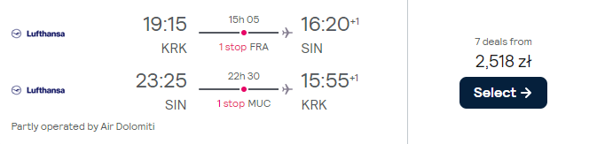 W celu uzyskania tytułowej ceny konieczne będzie dokonanie dwóch oddzielnych rezerwacji. Najpierw na „główną” podróż odbywającą się do Singapuru w terminie 14 – 28(29) kwietnia. Czekają cię loty realizowane na pokładzie samolotów linii lotniczej Lufthansa z bezpiecznymi, gwarantowanymi przez przewoźnika przesiadkami we Frankfurcie i Monachium. Tym razem do wyboru masz wyloty z aż 6 miast w Polsce: z Gdańska, Katowic, Krakowa, Poznania, Warszawy lub Wrocławia.