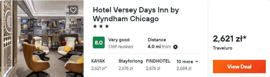 W Chicago zakwaterowanie będziecie w bardzo dobrym 3* hotelu Versey Days Inn by Wyndham, który znajduje się w sąsiedztwie parku North Pond Nature Sanctuary oraz stacji metra Diversey. Z lotniska w okolice miejsca noclegowego dojedziecie komunikacją publiczną lub wypożyczonym samochodem – szczegóły poniżej.
