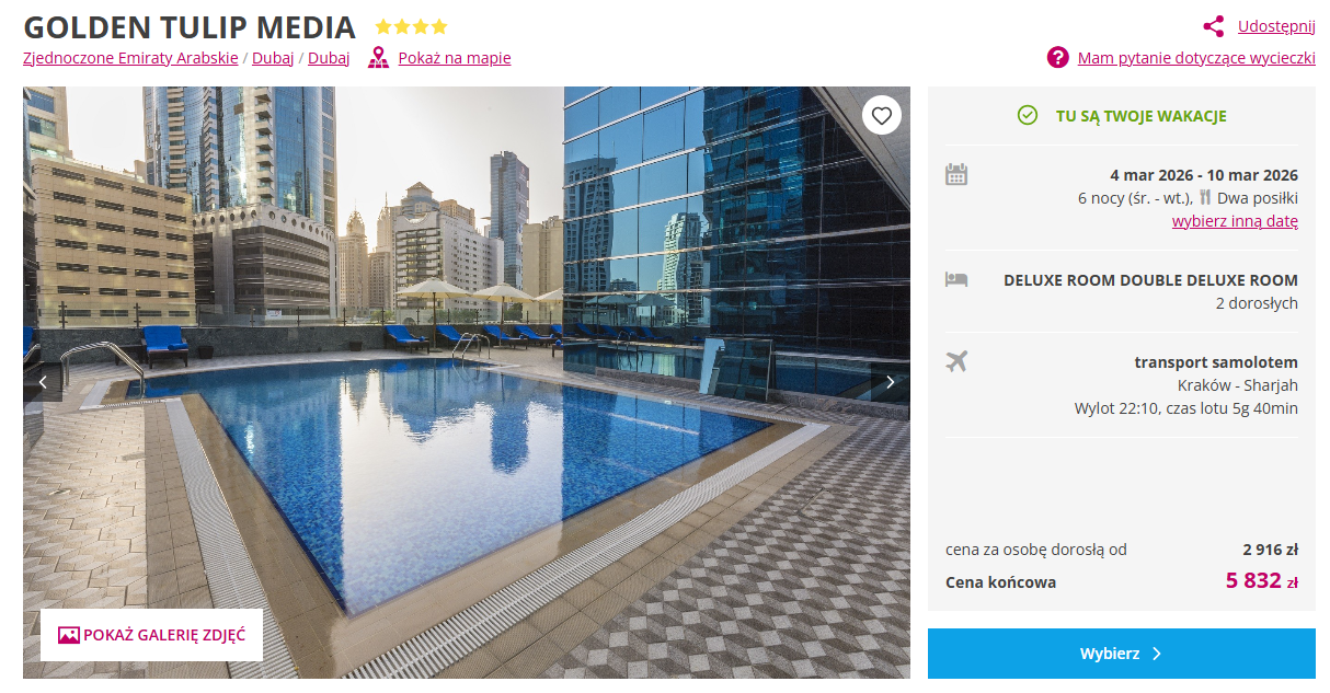 Do Zjednoczonych Emiratów Arabskich polecisz z Krakowa w terminie 4 – 10 marca. Czeka cię podróż do Szardży, a następnie transfery do Dubaju.