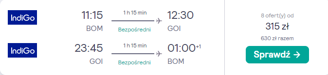 Podróż do Indii zaplanowana została w terminie 21 – 29 listopada. Korzystając z aktualnej promocji PLL LOT na początek zarezerwuj loty z Krakowa do Mumbaju. Czeka cię bezpośrednia podróż realizowana na pokładzie samolotu PLL LOT z Warszawy. Następnie kup loty z Mumbaju do Goa. Odbędą się one na pokładzie samolotów linii IndiGo.
