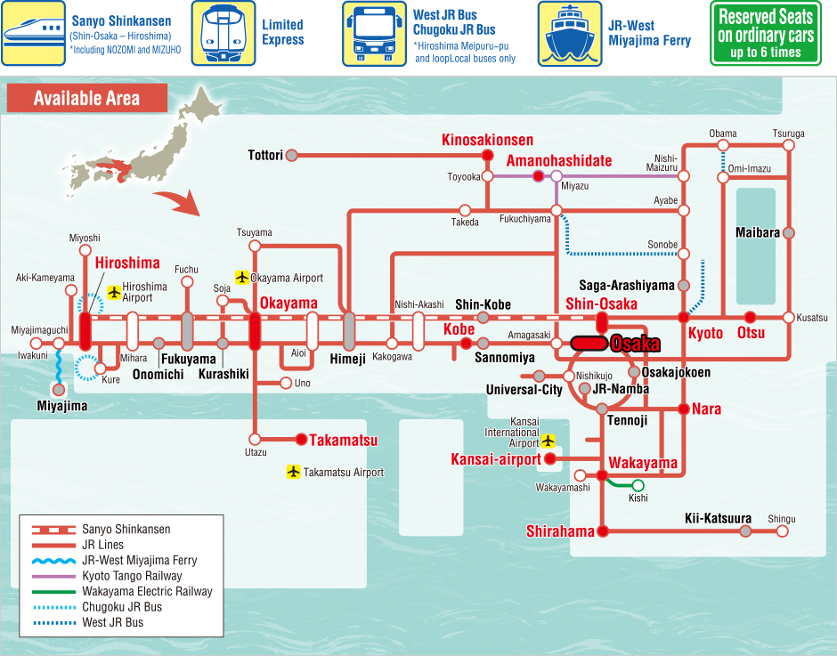 Po przylocie do Osaki zaopatrz się w bilet umożliwiający nielimitowe przejazdy pociągami, w tym Shinkansenem, który przemierza Kraj Kwitnącej Wiśni, mknąć po torach z prędkością dochodzącą do 405 km/h. Za taką „przepustkę” na region Kansai-Hiroszmia – ważną przez 5 kolejnych dni od pierwszego skasowania – zapłacisz 15000 JPY (ok. 433 PLN). Z własnego doświadczenia wiem, że taka opcja bardzo ułatwia zwiedzanie oraz „odciąża” budżet.