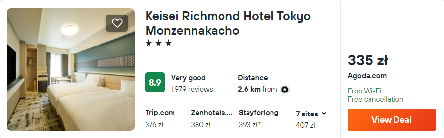 W Tokio proponuję ci noclegi w 3* hotelu Keisei Richmond Monzennakacho, który znajduje się pomiędzy parkami Fukagawa oraz Botancho. Każdy pokój składa się z części do relaksu i spania. W łazience jest wanna z prysznicem, suszarka do włosów, a dla gości przygotowano podstawowe przybory toaletowe.