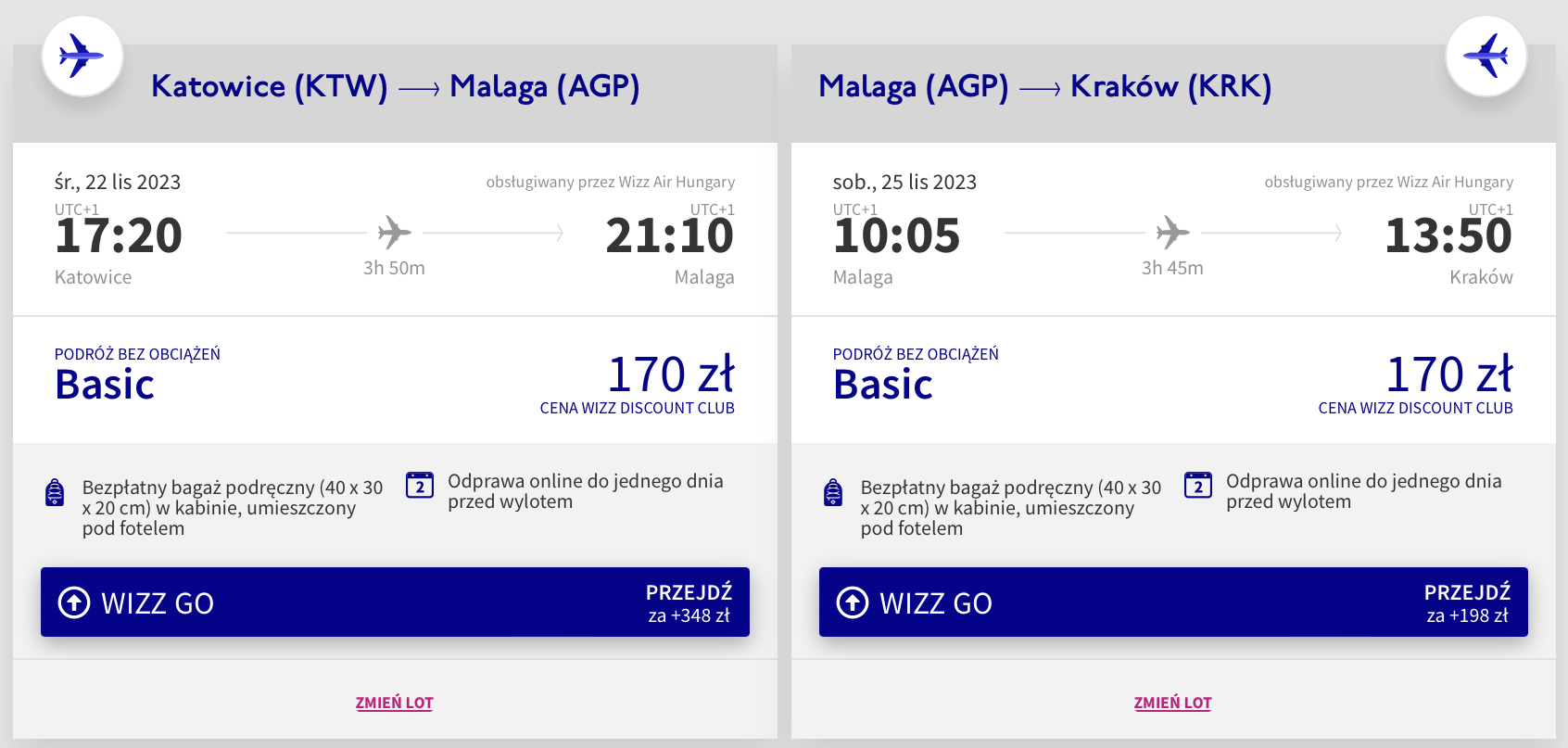 Do Hiszpanii udasz się z lotniska w Pyrzowicach w terminie 22-25 listopada. W obie strony polecisz na pokładzie samolotów linii Wizz Air z wliczonym małym bagażem podręcznym. Bilety w najniższej cenie dostępne są dla członków Wizz Discount Club. Chętni na loty bez WDC zapłacą więcej.