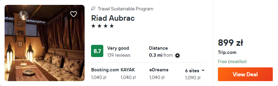 W Marrakeszu rekomenduję ci noclegi z codziennymi śniadaniami w 4* Riad Aubrac, na którego terenie mieści się kryty basen. Każdy pokój został urządzony w marokańskim stylu i wyposażony w klimatyzację, minibar oraz telewizor. W łazience jest prysznic. Na terenie całego obiektu będziesz mieć zapewniony dostęp do sieci WiFi.