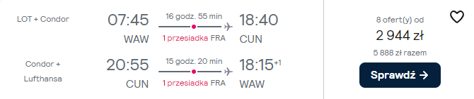 Do Cancun udasz się w terminie 12 – 19(20) marca. Do Meksyku polecisz z Warszawy liniami Condor, PLL LOT oraz Lufthansa. Po drodze przesiądziesz się we Frankfurcie.