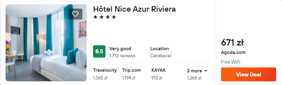 W Nicei polecam zakwaterowanie w świetnym 4* hotelu Azur Riviera, który znajduje się w centrum miasta. Z lotniska najłatwiej dostaniesz się tam komunikacją publiczną lub wynajętym samochodem.