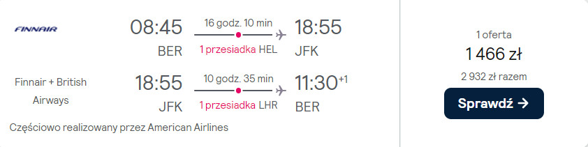 Do Stanów Zjednoczonych udasz się z portu lotniczego Berlin Brandenburg na przełomie stycznia i lutego. W obie strony polecisz na pokładach samolotów linii American Airlines, British Airways oraz Finnair. Po drodze czekać cię będą wygodne przesiadki w Londynie i Helsinkach. W cenie biletu zabrać możesz ze sobą bagaż podręczny oraz jeden przedmiot osobisty (mały plecak lub damską torebkę).