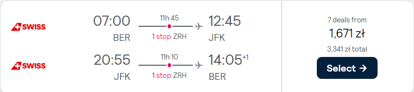 Do Nowego Jorku udasz się z berlińskiego portu lotniczego im. Willy’ego Brandta w terminie 10-16 maja. W obie strony polecisz na pokładach samolotów linii Swiss International Air Lines z wygodnymi przesiadkami w Zurichu. W cenie biletu zabrać możesz ze sobą bagaż podręczny oraz jeden przedmiot osobisty (mały plecak lub damską torebkę).