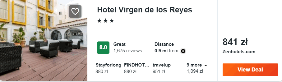 W Sewilli proponuję wam noclegi w 3* hotelu Virgen de los Reyes, który od zabytkowe centrum miasta oddalony jest o 20 minut spokojnego spaceru. Wszystkie pokoje zostały wyposażone w klimatyzację oraz telewizor LCD. W każdym jest łazienka z wanną i prysznicem oraz suszarka do włosów.