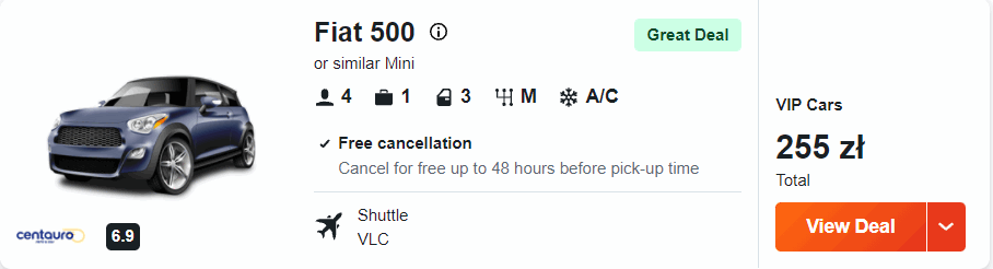 Poza sezonem ceny wynajmu samochodów są bardzo atrakcyjne. Za wypożyczenie Fiata 500 lub podobnego modelu zapłacicie tylko 64 PLN/doba.