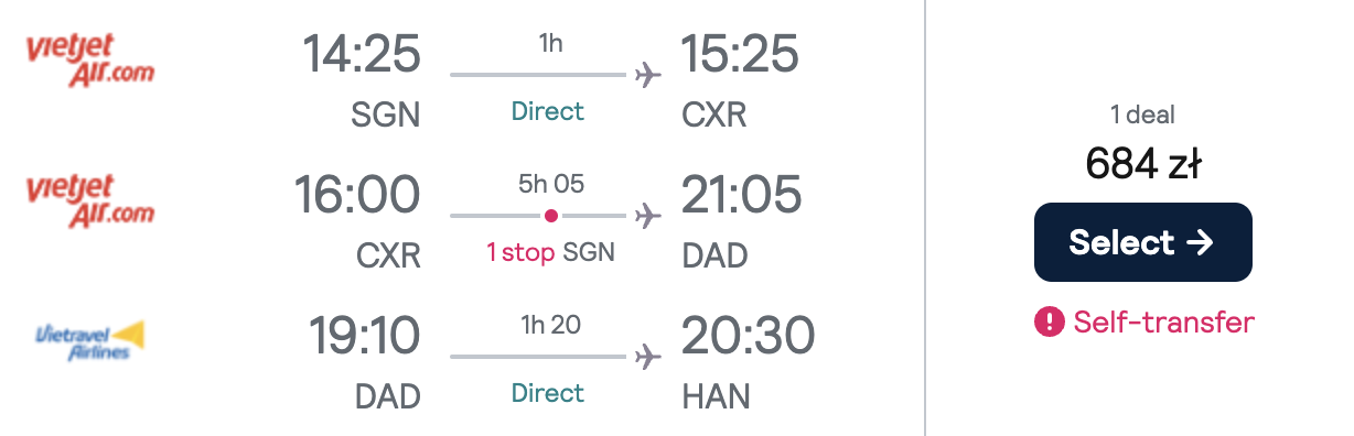 Następnie zarezerwuj loty krajowe w Wietnamie. Bilety na Trasie Ho Chi Minh – Nha Trang – Da Nang – Hanoi kupisz w tym miejscu. Skorzystasz z usług lokalnych linii: Vietjet oraz Vietnam Airlines.