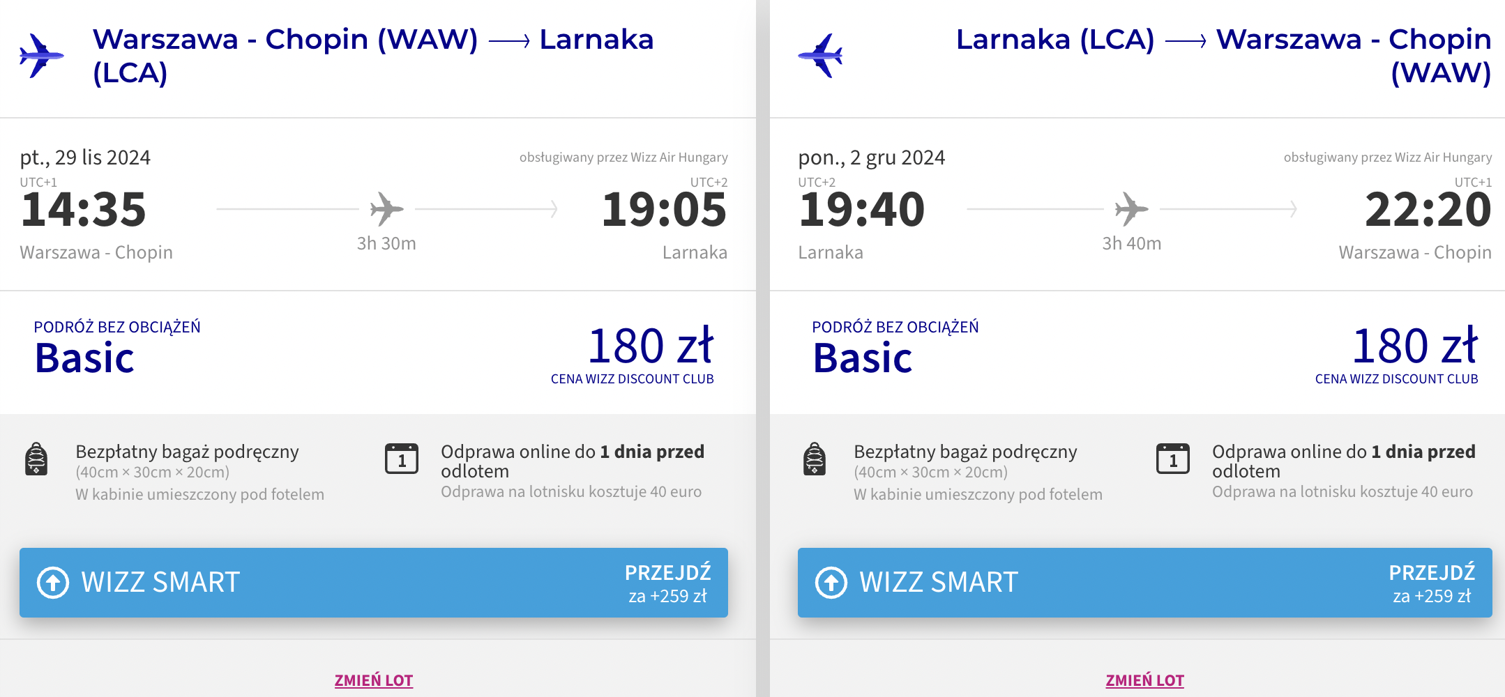 Na Cypr udasz się w terminie 29 listopada – 2 grudnia (piątek-poniedziałek) z lotniska w Warszawie. W obie strony podróżować będziesz bezpośrednio linią Wizz Air z bagażem podręcznym. Bilety w najniższej cenie dostępne są dla członków Wizz Discount Club. Chętni na loty bez WDC zapłacą więcej.