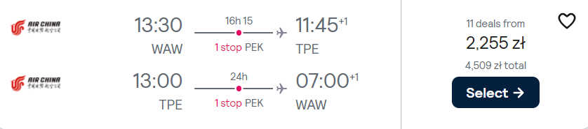 Do Tajpej polecisz z warszawskiego lotniska im. Fryderyka Chopina czerwcu. W obie strony polecisz linią Air China z przesiadką w Pekinie. Do Azji zabrać ze sobą możesz bagaż rejestrowany (nadawanym do luku), podręczny oraz przedmiot osobisty.