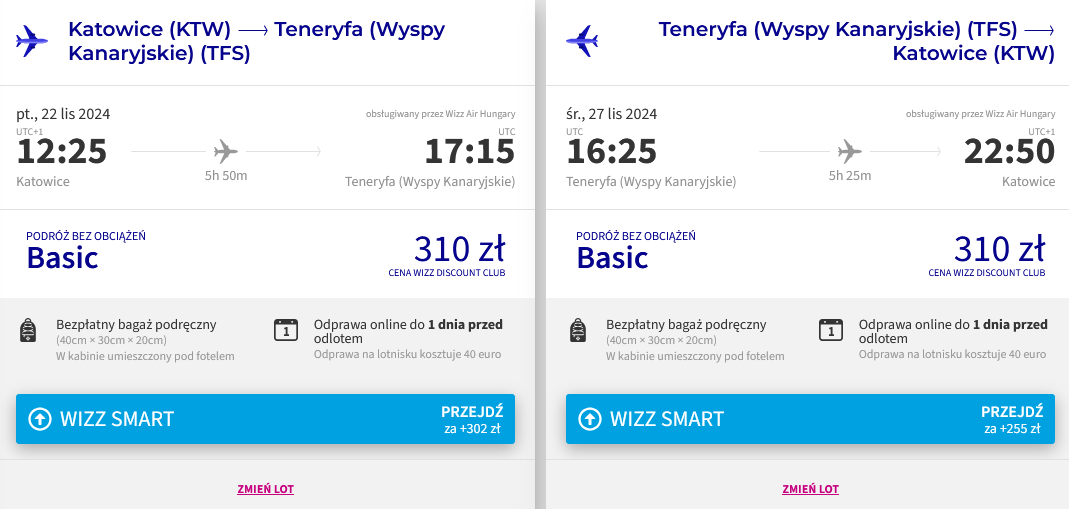 Do Hiszpanii wybierzesz się w dogodnym terminie (piątek – środa) 22-27 listopada z Katowic. Na Teneryfę polecisz bezpośrednio linią Wizz Air, z wliczonym w cenę biletu bagażem podręcznym. Bilety w najniższej cenie dostępne są dla członków Wizz Discount Club.