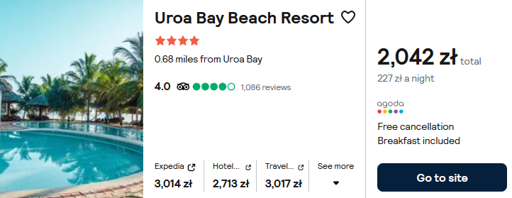Na Zanzibarze rekomenduję pobyt w 4* hotelu Uroa Bay Beach Resort. Znajdziesz w nim między innymi basen, siłownię, restaurację oraz bar. Obiekt zlokalizowany jest przy samej plaży. W cenę noclegów zostały wliczone śniadania.