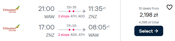 Do Afryki udasz się w terminie 21 (22) listopada – 1 (2) grudnia z lotniska w Warszawie. Na Zanzibar polecisz linią Ethiopian Airlines z przystankiem technicznym w Atenach (bez wysiadania z samolotu) oraz przesiadką w Addis Abebie. W cenę biletu wliczony jest bagaż podręczny i rejestrowany.