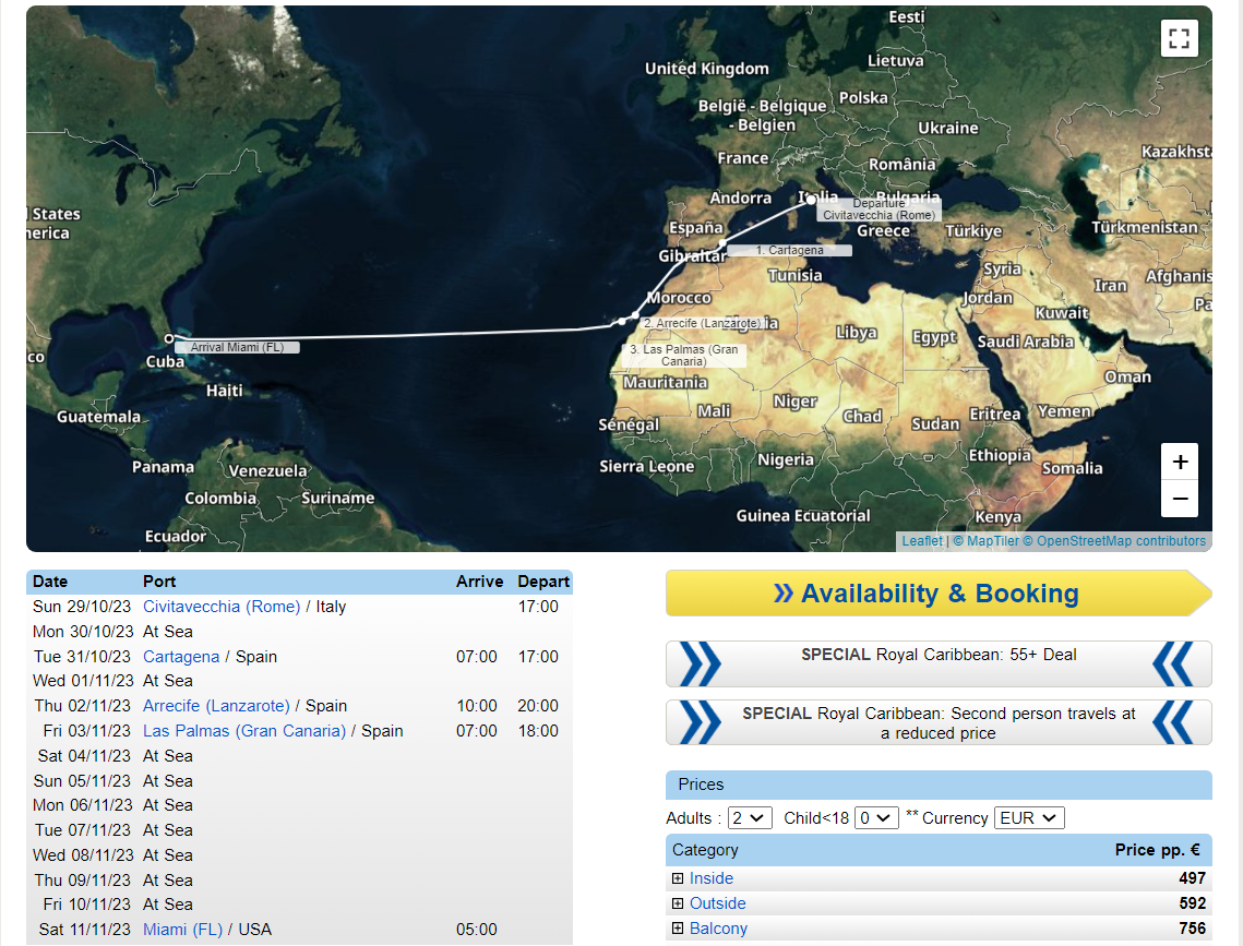 W dniach 29 października – 11 listopada czeka cię rejs transatlantycki. Jego trasa wygląda następująco: Rzym – Kartagena – Lanzarote – Gran Canaria – Miami. W cenę (497 EUR, około 2246 PLN za osobę) wliczono wszystkie opłaty, animacje oraz wyżywienie.