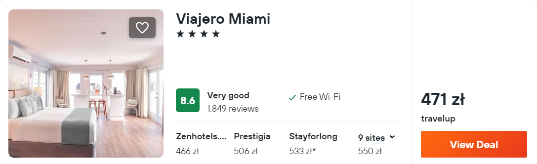 Natomiast w Miami rekomenduję 4* hotel Viajero. Obiekt mieści się niedaleko South Beach i jest pozytywnie oceniany przez dotychczasowych gości.