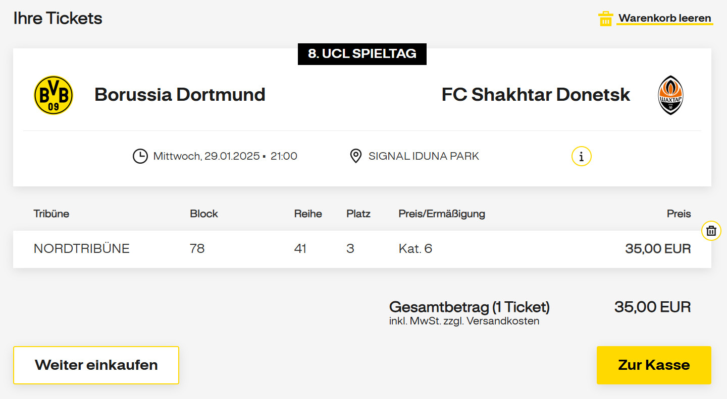 W cenę pakietu wliczyłem także bilet na mecz Ligi Mistrzów (Borussia Dortmund-Szachtar Donieck), który odbędzie w środę 29 stycznia o godzinie 21:00, na stadionie Signal Iduna Park. Wejściówkę możesz nabyć na oficjalnej stronie klubu z Dortmundu. Do jej kupna konieczne jest posiadanie konta w witrynie bvb.de, które założysz bezpłatnie.