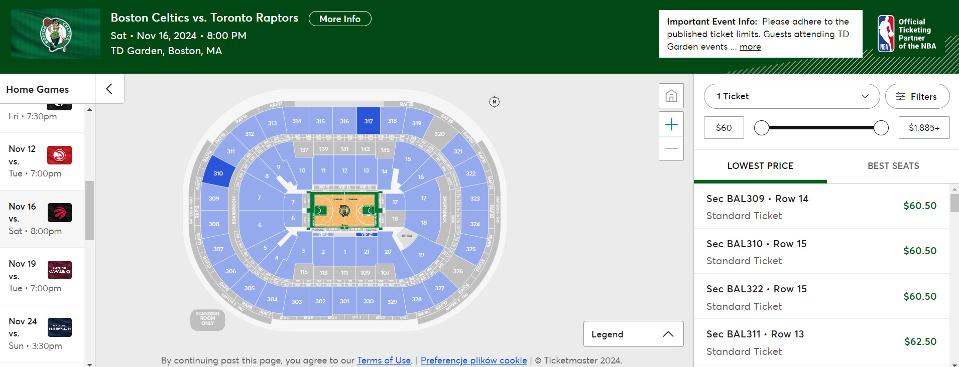 Na pierwszy mecz udasz się 16 listopada. Będzie to spotkanie ligi NBA pomiędzy drużynami Boston Celtics a Toronto Raptors. Odbędzie się ono w hali TD Garden o godzinie 20:00. Ceny najtańszych biletów zaczynają się od 60.5 USD (ok. 233 PLN). Wejściówkę kupisz za pośrednictwem strony ticketmaster.com.