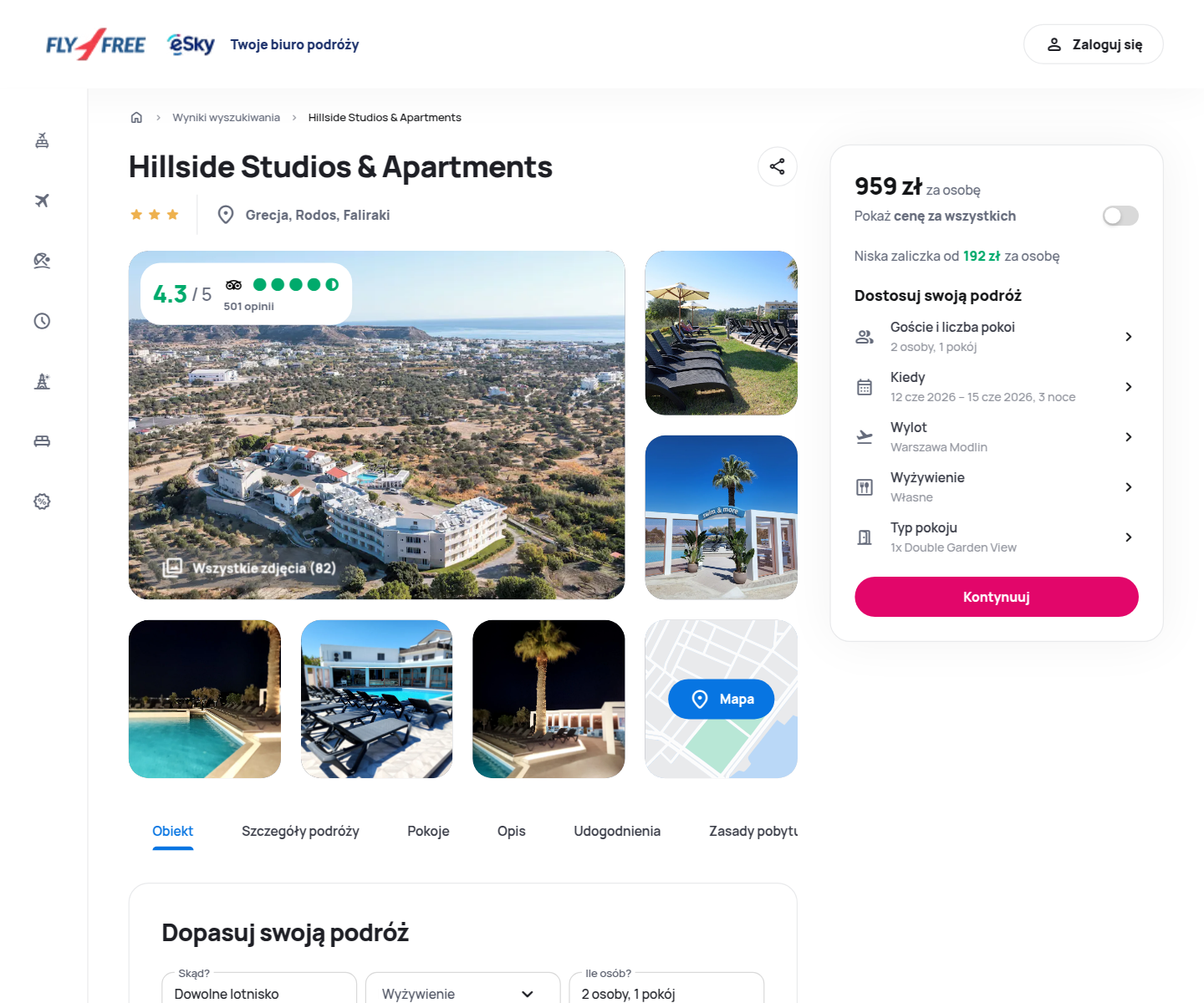 Na greckiej wyspie zatrzymasz się w 3* hotelu Hillside Studios & Apartments w Faliraki, popularnej miejscowości turystycznej. Obiekt dysponuje odkrytym basenem z widokiem na Morze Egejskie, barem oraz restauracją serwującą lokalne dania. Goście chwalą obiekt za czystość, przyjazną obsługę oraz lokalizację blisko plaży i centrum. Wiele osób docenia spokojną atmosferę oraz komfortowe pokoje z balkonami. Z hotelu łatwo dotrzesz do zatoki Anthony Quinn czy średniowiecznego miasta Rodos.
