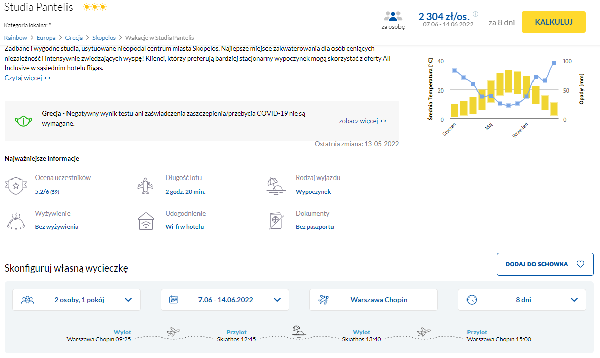 Na urlop do Hellady udacie się w terminie 7 – 14 czerwca. Polecicie bezpośrednio z Warszawy do Skiatos, a następnie czeka was przeprawa promowa na Skopelos. Po drodze będzie okazja również na szybkie zwiedzenie pierwszej wyspy.