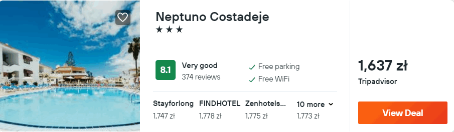 Na hiszpańskiej wyspie zatrzymacie się w 3* hotelu Neptuno Costadeje, który znajduje w kurorcie Costa Adeje. Z lotniska w okolice miejsca noclegowego dojedziecie autobusami nr 111 oraz 447 lub wypożyczonym samochodem – szczegóły poniżej.
