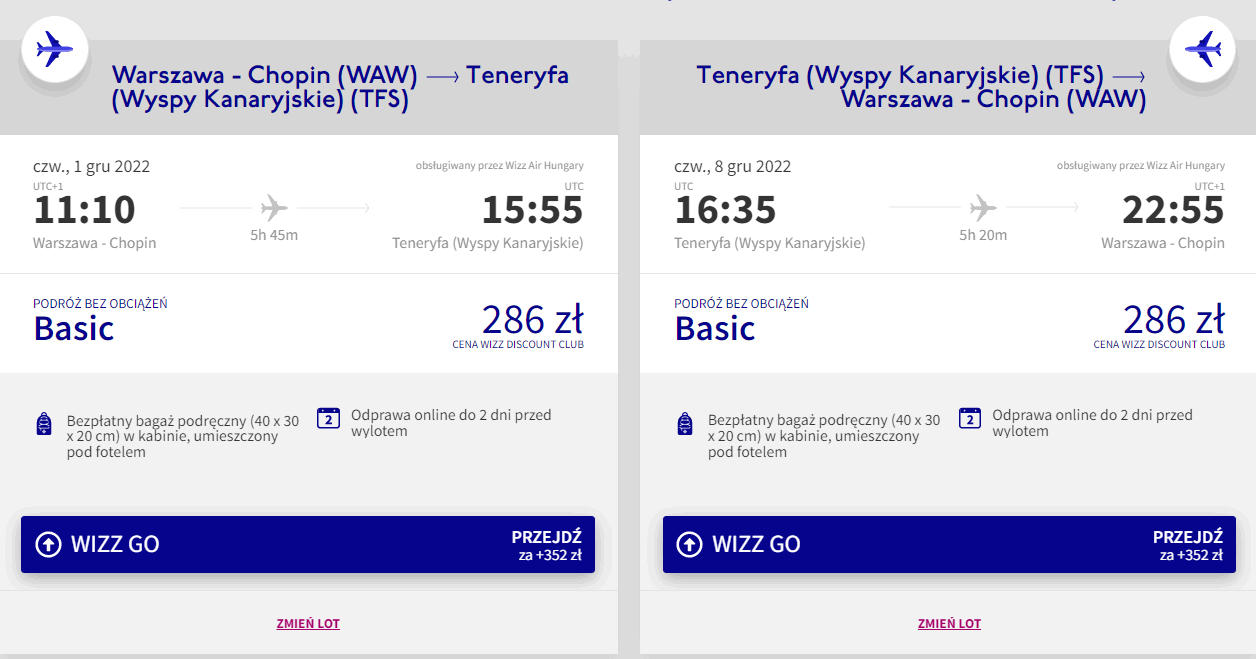 Na Teneryfę udacie się dopiero w grudniu (1-8.12). Podróż rozpoczniecie i zakończycie na warszawskim lotnisku im. Chopina. W obie strony polecicie bezpośrednio na pokładach samolotów linii Wizz Air z wliczonym małym bagażem podręcznym. Bilety w najniższej cenie dostępne są dla osób z Wizz Discount Club, chętni na loty bez WDC zapłacą nieco więcej.