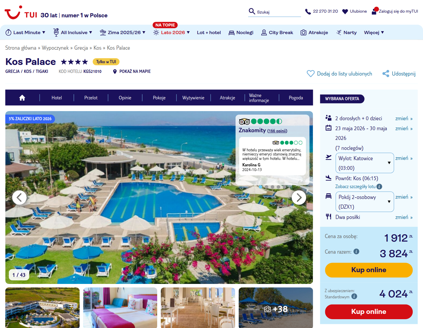 Na miejscu zatrzymasz się w 4* hotelu Kos Palace w Tigaki. Obiekt znajduje się zaledwie kilka kroków od jednej z najpiękniejszych plaż na wyspie. Goście chwalą przestronne pokoje, czystość oraz doskonałą lokalizację blisko morza. Hotel oferuje duży basen z ogrodem, brodzik dla dzieci, restaurację, bar oraz strefę spa. Dodatkowym atutem jest przystanek autobusowy przy hotelu, umożliwiający łatwy dojazd do miasta Kos.