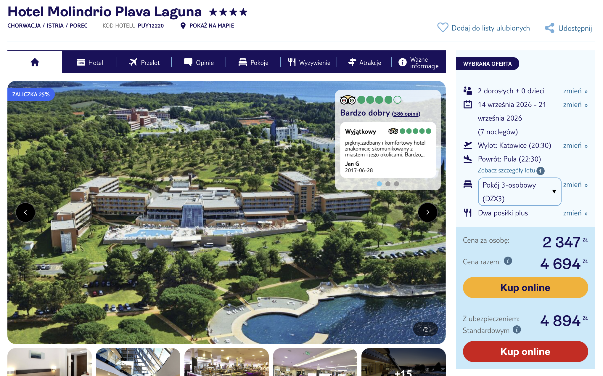 W Poreču zatrzymasz się w nowoczesnym 4* hotelu Molindrio Plava Laguna, położonym zaledwie 300 metrów od plaży. Goście chwalą czystość pokoi, profesjonalną obsługę oraz smaczną regionalną kuchnię serwowaną w hotelowej restauracji. Obiekt dysponuje dużym basenem ze słodką wodą, centrum odnowy biologicznej z sauną i masażami oraz bogatym zapleczem sportowym. Dla najmłodszych przygotowano plac zabaw i animacje. W okolicy warto odwiedzić zabytkowe centrum Poreča z bazyliką Eufrazjana wpisaną na listę UNESCO, Aquapark Istralandia czy malownicze miasteczko Rovinj.